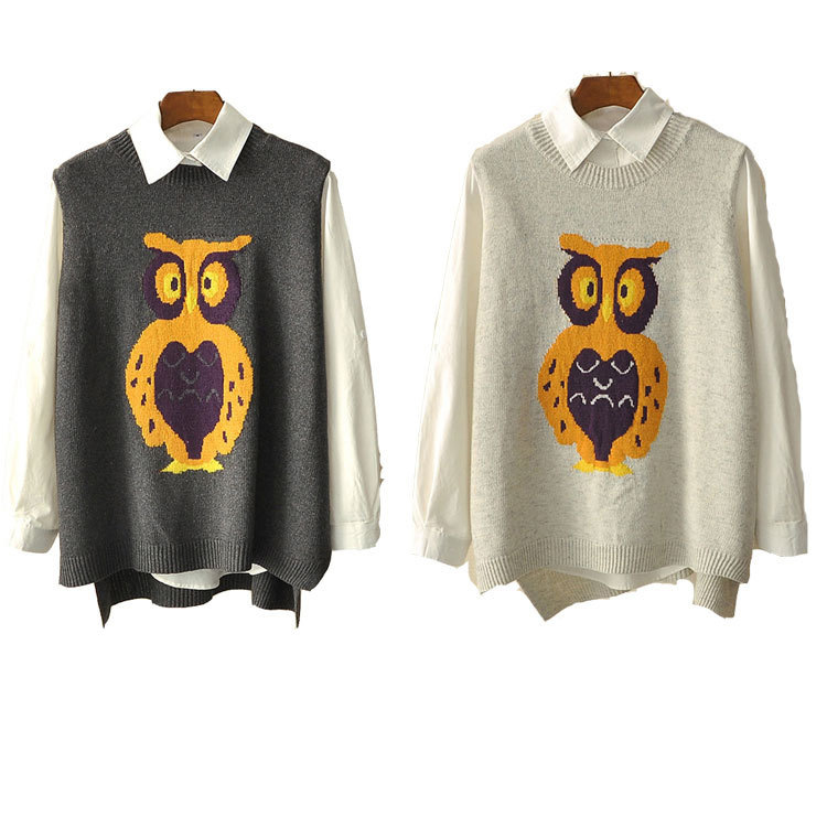 韓版外貿(mào)女裝秋冬針織馬甲背心 女士貓頭鷹寬松大碼無袖套頭毛衣 /