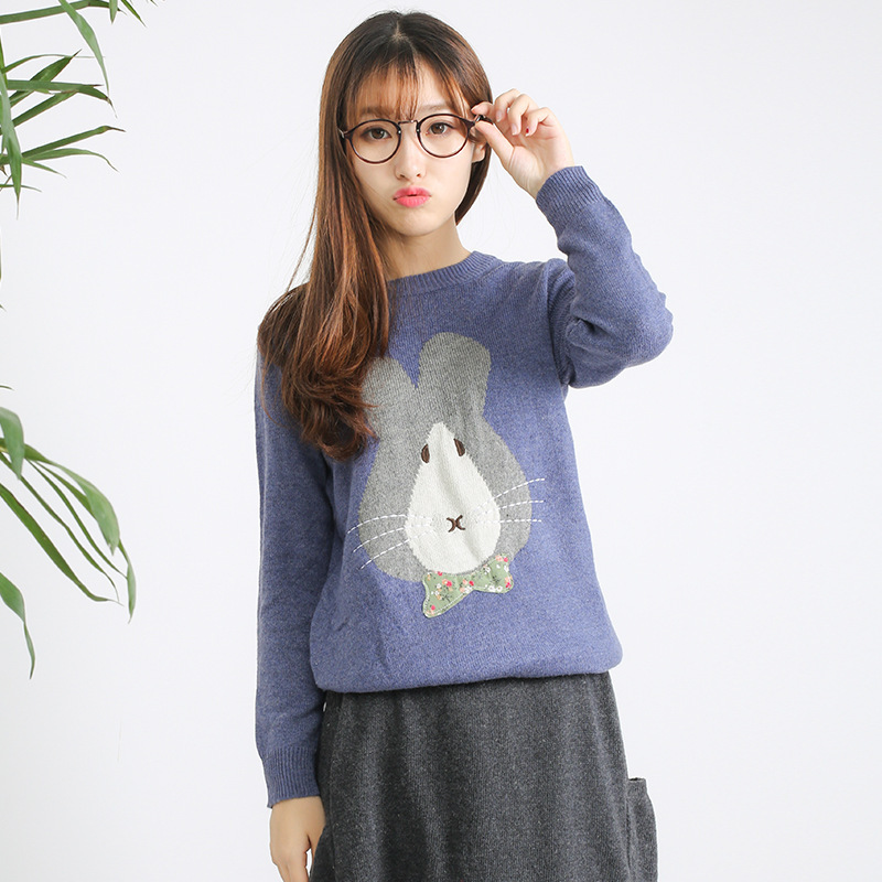 森女文藝卡通小倉鼠印花針織衫 秋冬女式圓領(lǐng)羊毛套頭毛衣上衣 /