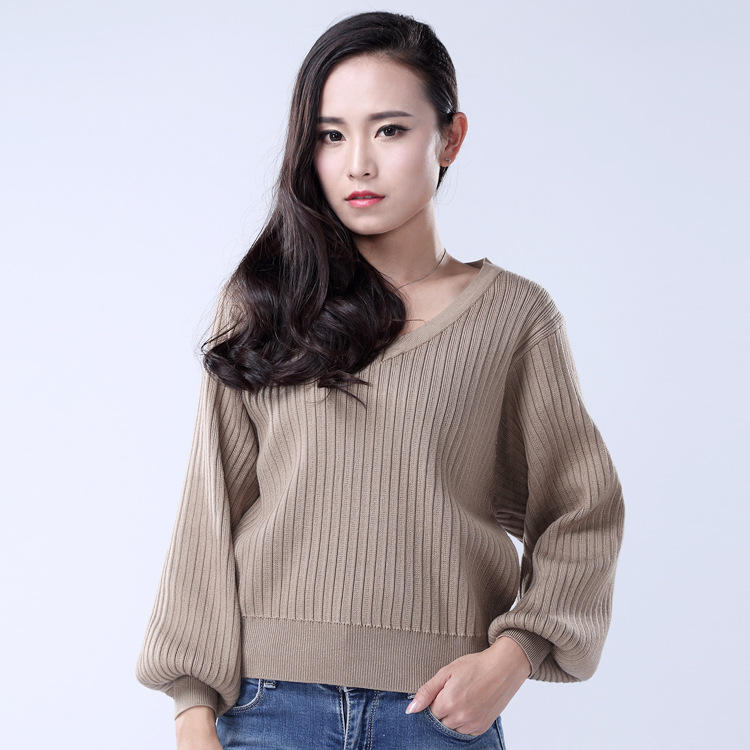 2015秋冬新款毛衣女V領(lǐng)百搭上衣 燈籠袖短款毛衣針織衫套頭毛衫女 /