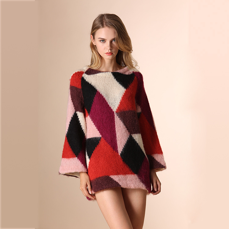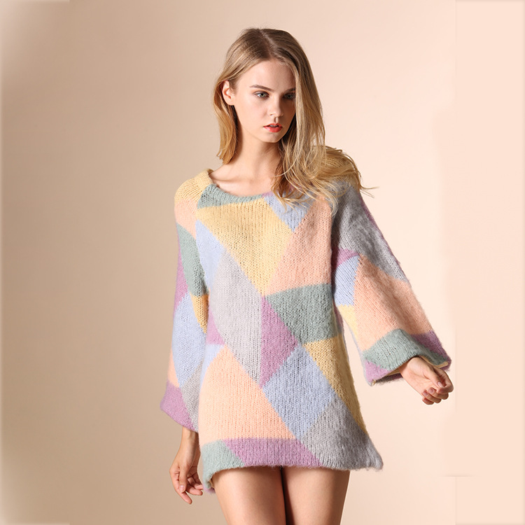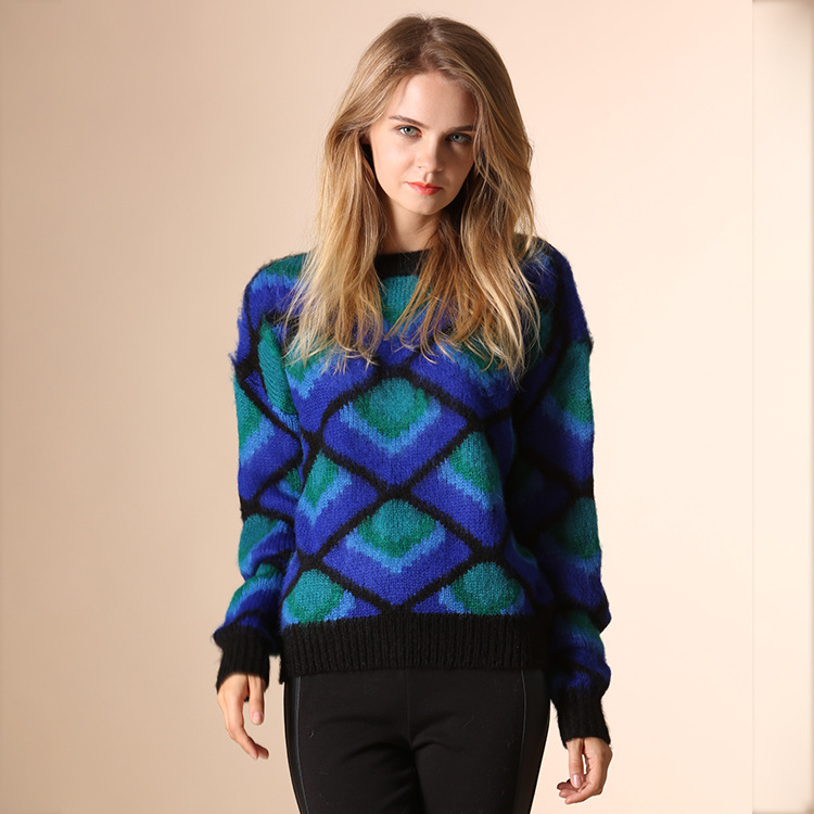 2015秋冬新款 歐美女裝毛衣馬海毛毛衣女菱形格子拼色長袖針織衫 /