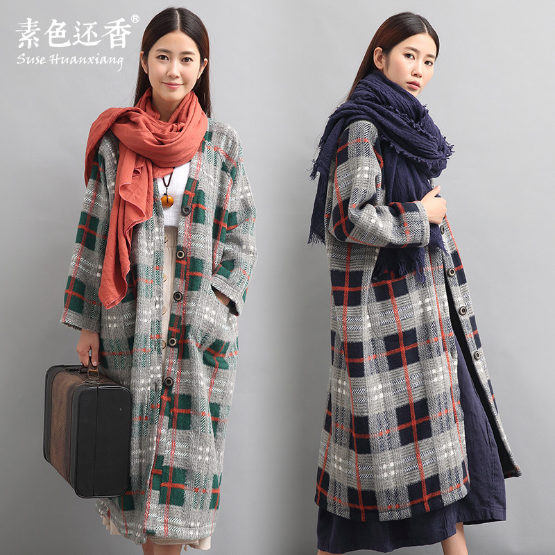 2015秋冬裝新款加長款外套休閑寬松大碼文藝格子毛呢大衣女 /
