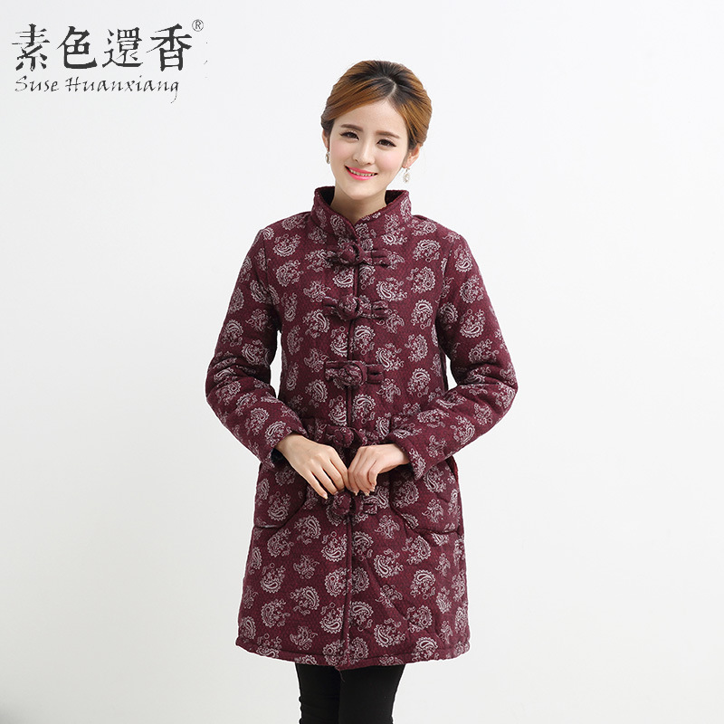 2015新款大碼民族風女裝冬裝棉衣棉服中式棉麻印花中長款棉襖外套 /