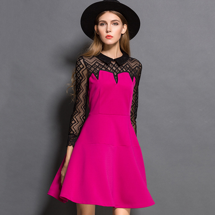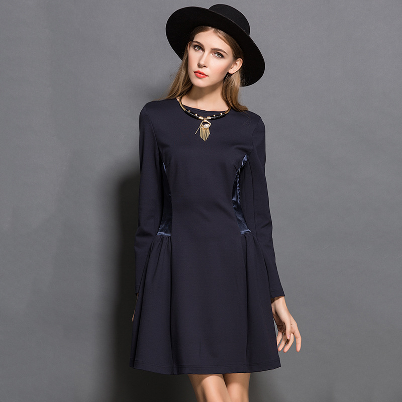 春季新款純色棉百搭修身收腰連衣裙 歐美大擺長袖連衣裙拼接女裝 /