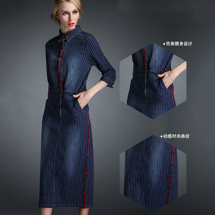 2016春季新款女裝連衣裙 長款女式牛仔連衣裙 歐美女裝條紋牛仔裙 /
