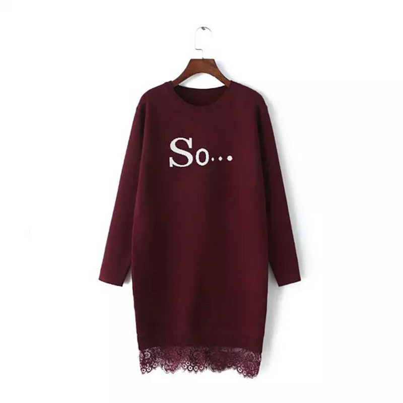 秋冬新品蕾絲拼接毛衣針織裙圓領長袖中長款打底衫秋冬針織連衣裙 /