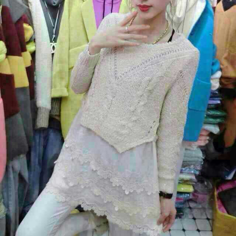 針織拼接小衫 韓版修身長袖蕾絲打底衫 毛衣百搭簡約大方 低價中 /