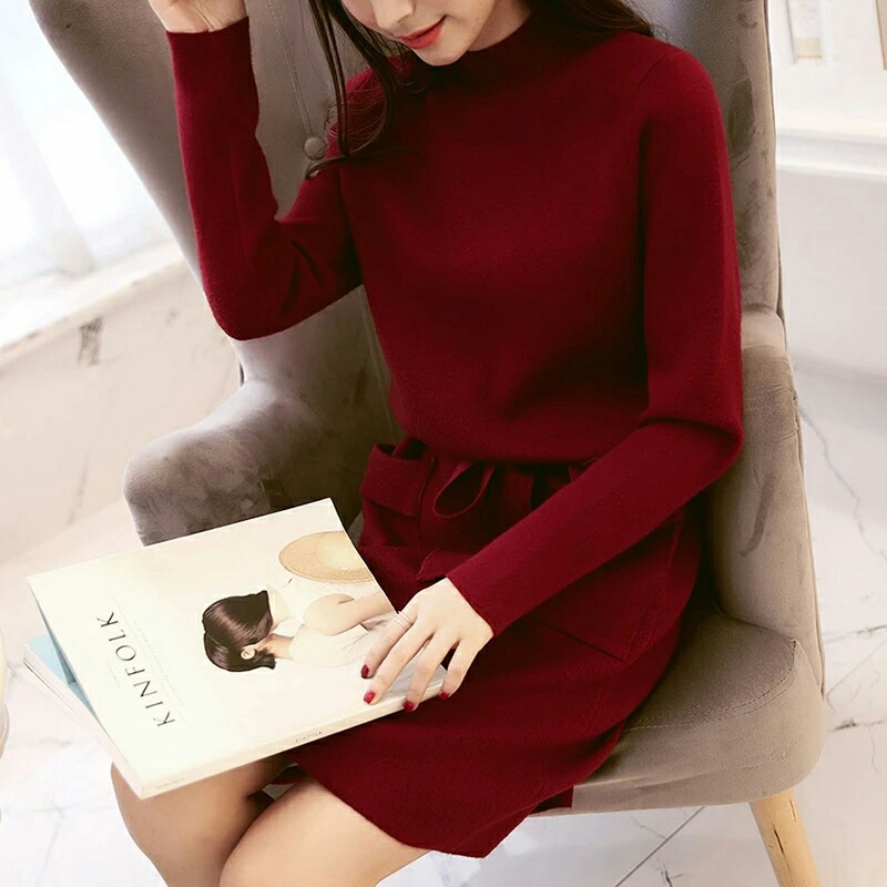 冬季新款韓版時尚寬松長款修身純色有腰帶包芯紗針織連衣裙女爆款 /