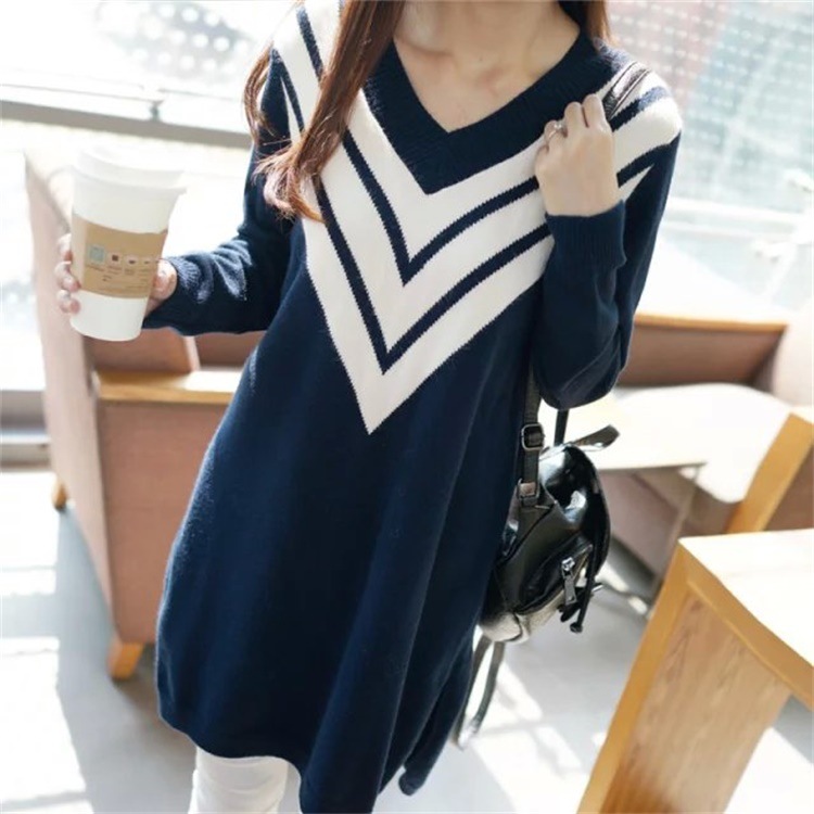 冬季新款韓版時尚寬松中長款V領拼色V字條紋針織衫女式毛衣連衣裙 /