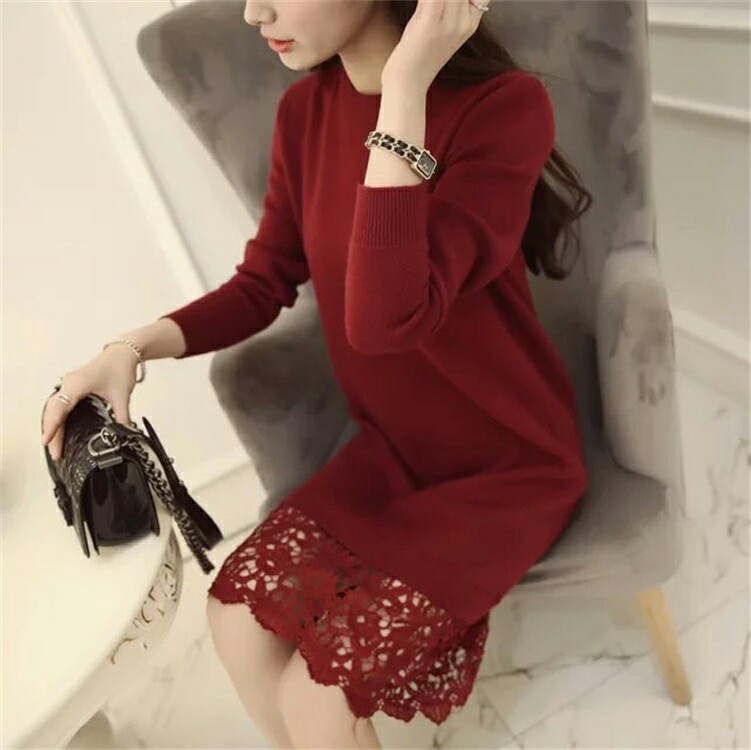 冬季新款韓版時尚寬松長款下擺蕾絲邊針織衫女連衣裙一件代發女裝 /