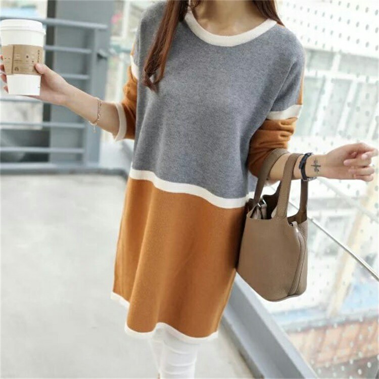 冬季新款韓版時尚爆款拼色撞色拼接圓領套頭中長款針織衫女連衣裙 /