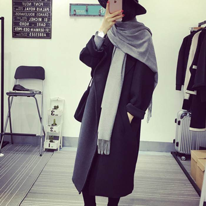 5613 秋冬歐美寬松百搭純色長款大翻領毛呢外套大衣女 /
