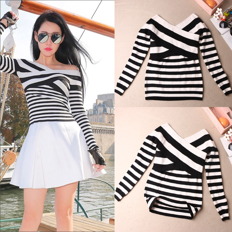 2015新款毛衣女 左岸瀟明星同款 黑白條紋一字領針織套頭毛衣批發 /
