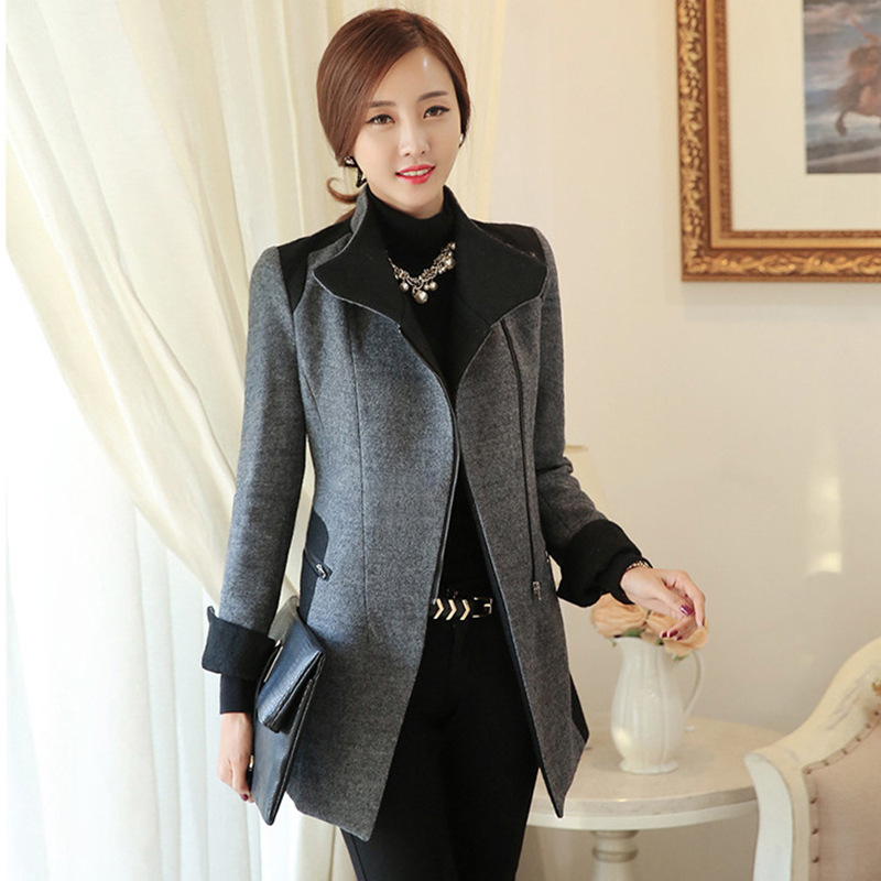 2015秋冬新款韓版修身羊毛呢子拼接加厚西服中長款小西裝外套女 /