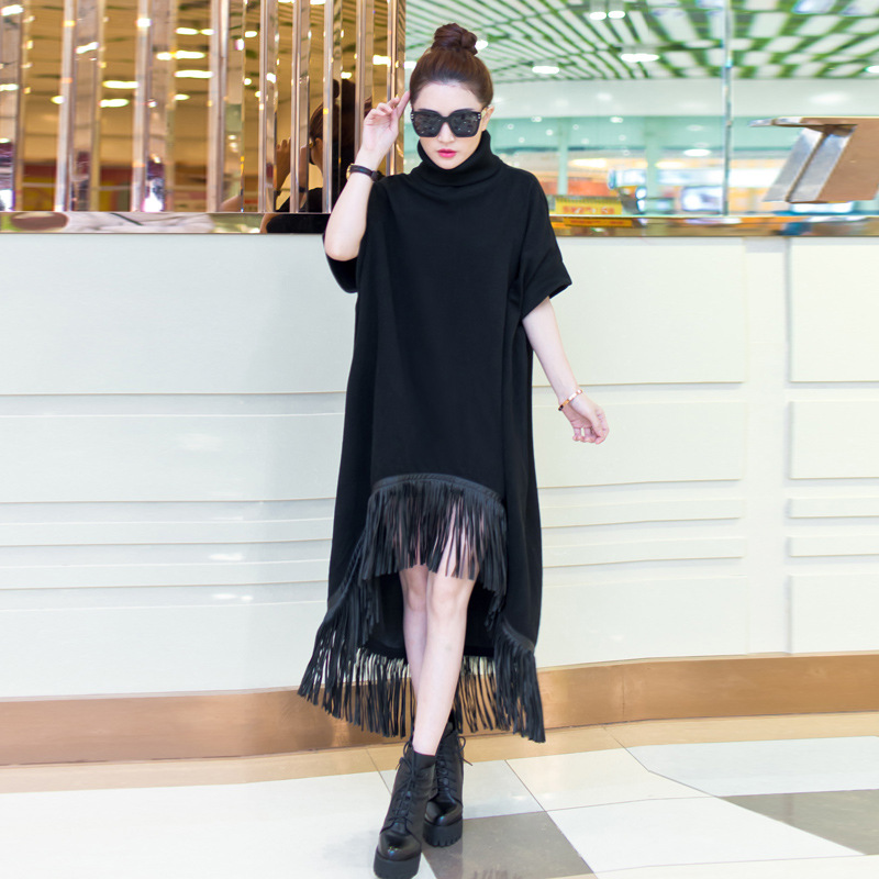 2015歐美秋冬季新品流蘇中長款針織拼接裙女裝短袖連衣裙潮 /