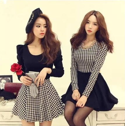 廠家直銷2015秋季韓版千鳥格長袖修身氣質連衣裙 打底裙 /