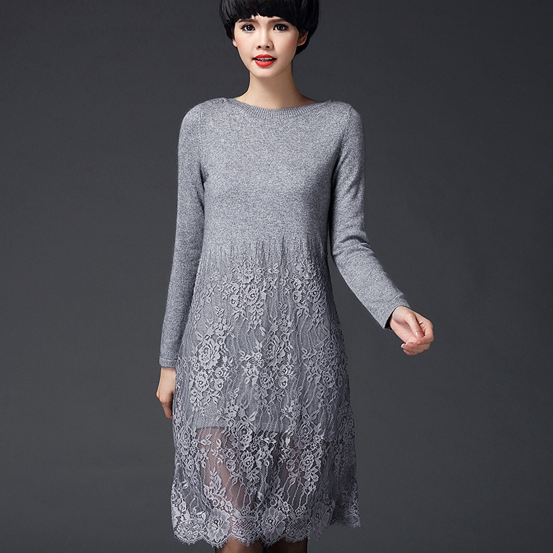 歐洲站2015秋新款女裝 蕾絲拼接長袖連衣裙 貂絨針織連衣裙中長款 /