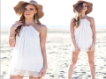 2015歐美新款下擺蕾絲花邊拼接無袖掛脖系帶寬松短裙 /