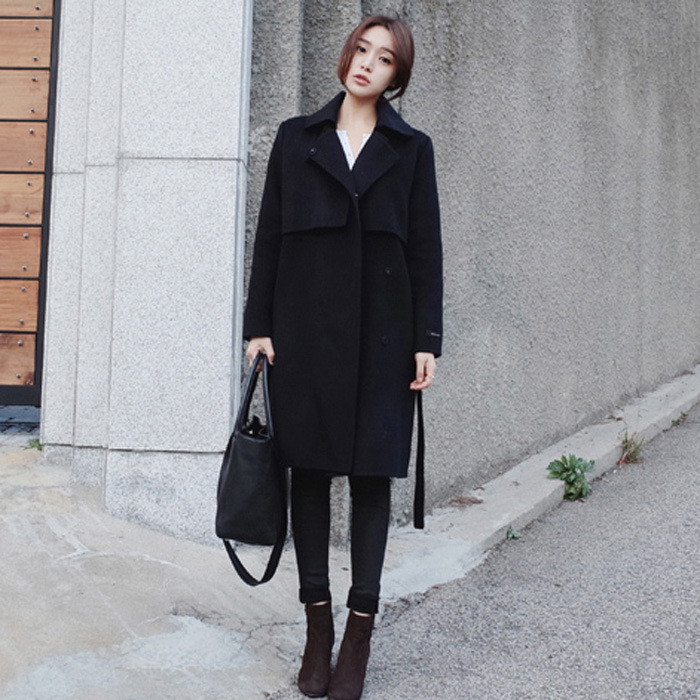 韓國2015秋冬新款韓版氣質修身顯瘦收腰系帶中長款毛呢大衣外套女 /