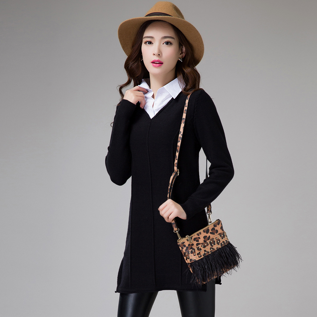 秋冬新款大碼女裝假兩件毛衣女針織打底衫套頭中長款襯衫領外套潮 /