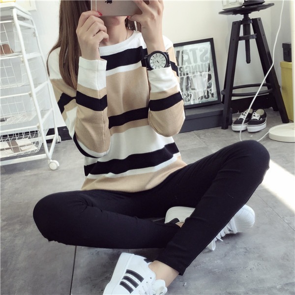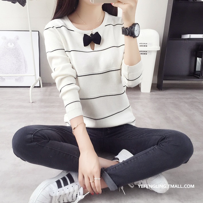 秋冬打底衫新款套頭毛衣短款條紋針織衫新品秋季女裝韓版初秋上衣 /
