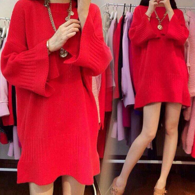 韓國(guó)代購(gòu)歐洲站2015秋裝新款喇叭袖中長(zhǎng)款紅色毛衣寬松針織連衣裙 /