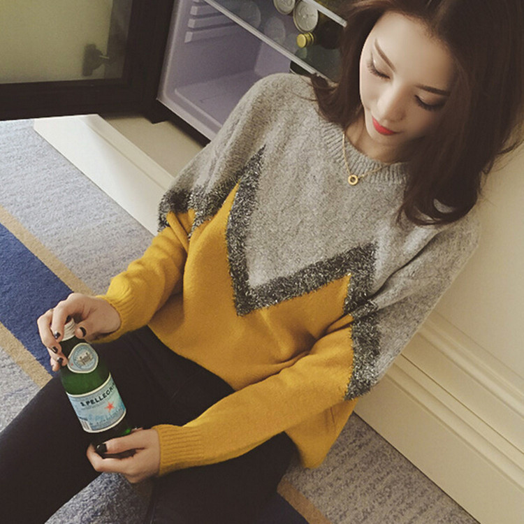 2015冬季韓國新款圓領(lǐng)亮絲撞色套頭針織衫毛衣寬松顯瘦上衣女 /