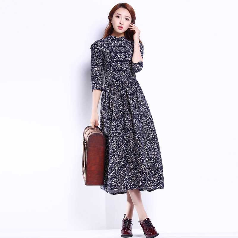 2015春秋新款連衣裙復古碎花亞麻連衣裙棉麻中袖大擺印花長裙 /