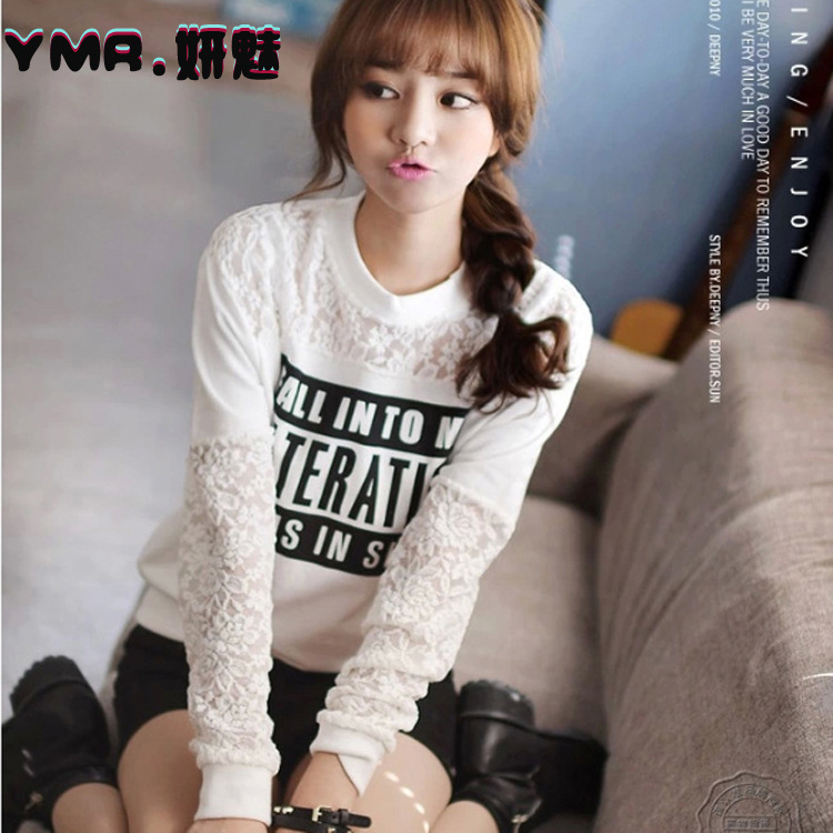 2014韓版秋款女裝 薄款蕾絲拼接長袖 女士衛衣批發 /