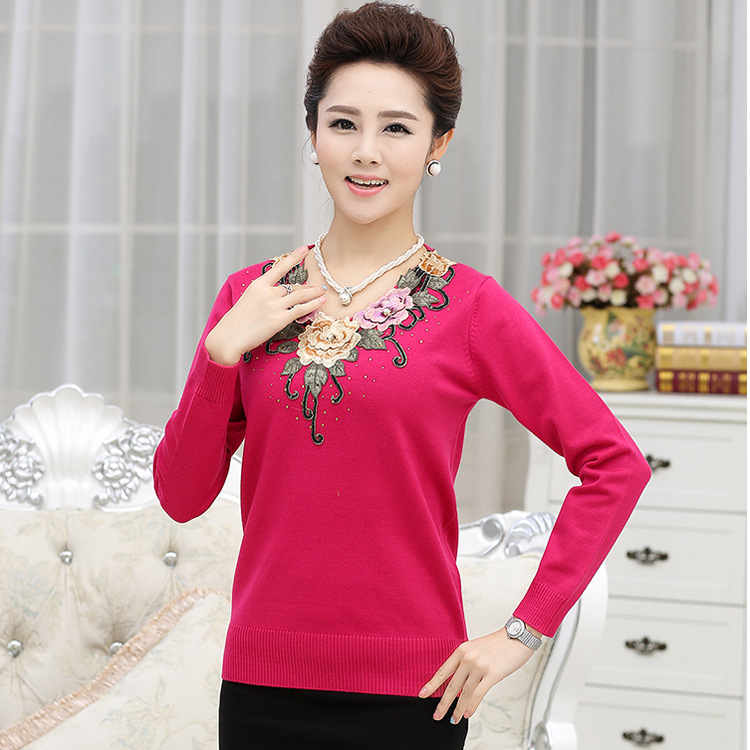 【特惠價】2014新款時尚羊毛衫 V領繡花長袖針織衫 媽媽裝批發 /