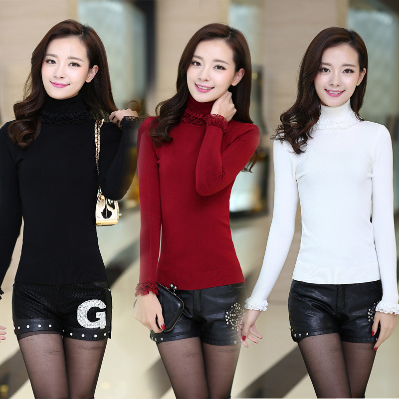 2015新款女裝韓版打底衫高領蕾絲花邊修身長袖針織衫毛衣 /