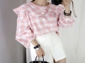 2015秋季新款 可愛甜美娃娃領荷葉邊格子長袖襯衫女 /