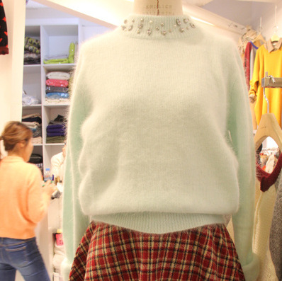 韓國東大門代購立領套頭加厚毛茸茸毛毛釘珠毛衣套頭 /