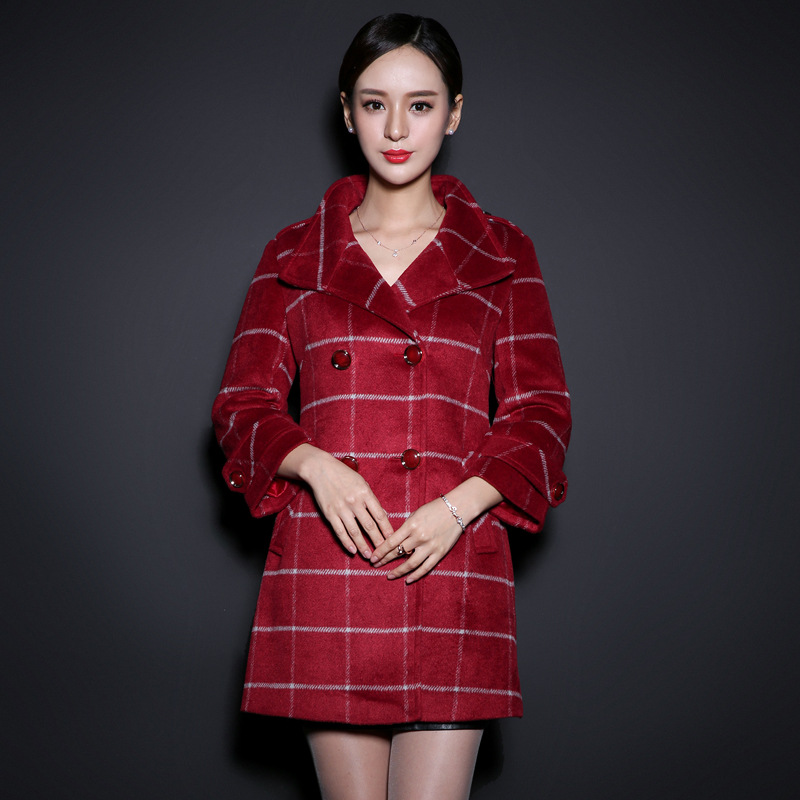 2016春裝新款毛呢外套女中長款 優雅氣質格子羊毛呢子大衣女裝 /