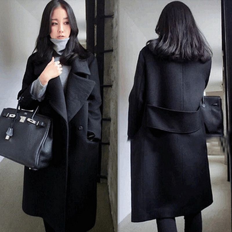 秋冬中長款顯瘦羊毛呢外套夾棉加厚 大翻領黑色寬松呢大衣女 /
