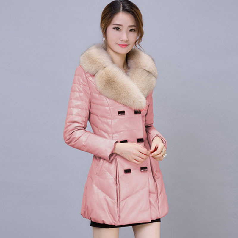 2015新款真皮羽絨服女中長款狐貍毛領修身外套海寧皮衣皮羽絨服 /