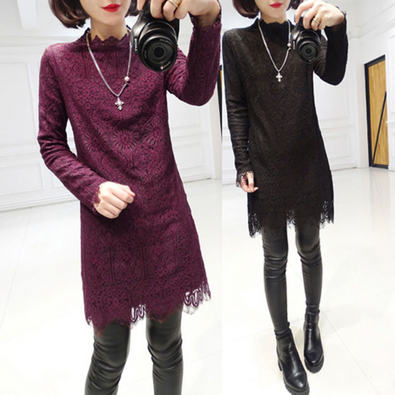 加絨加厚蕾絲打底衫女上衣顯瘦韓版中長款修身長袖蕾絲衫 /