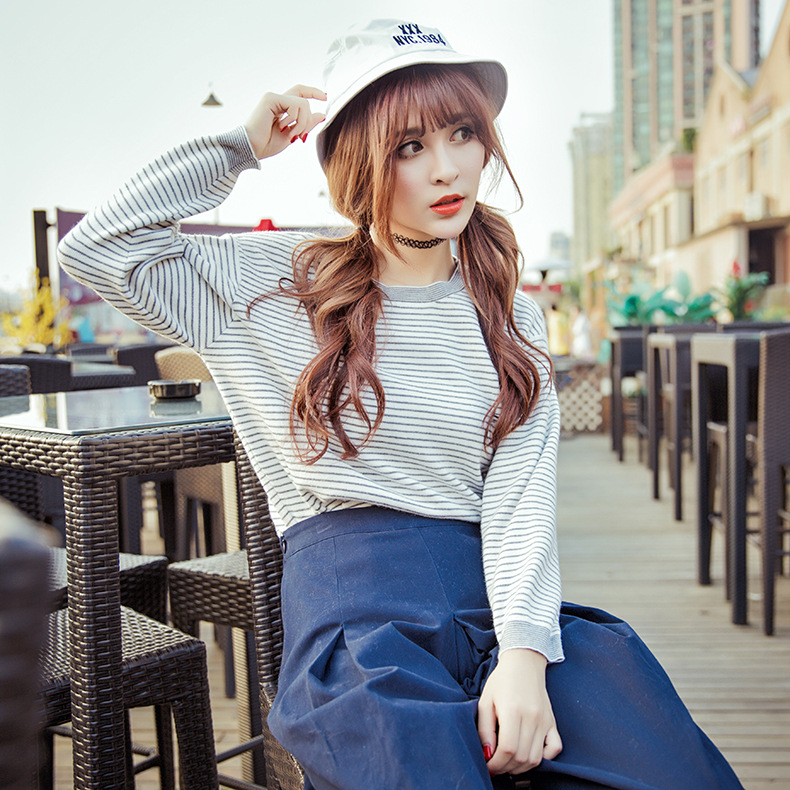 2015秋冬新款條紋打底衫韓版修身顯瘦長袖女裝針織衫女套頭毛衣女 /