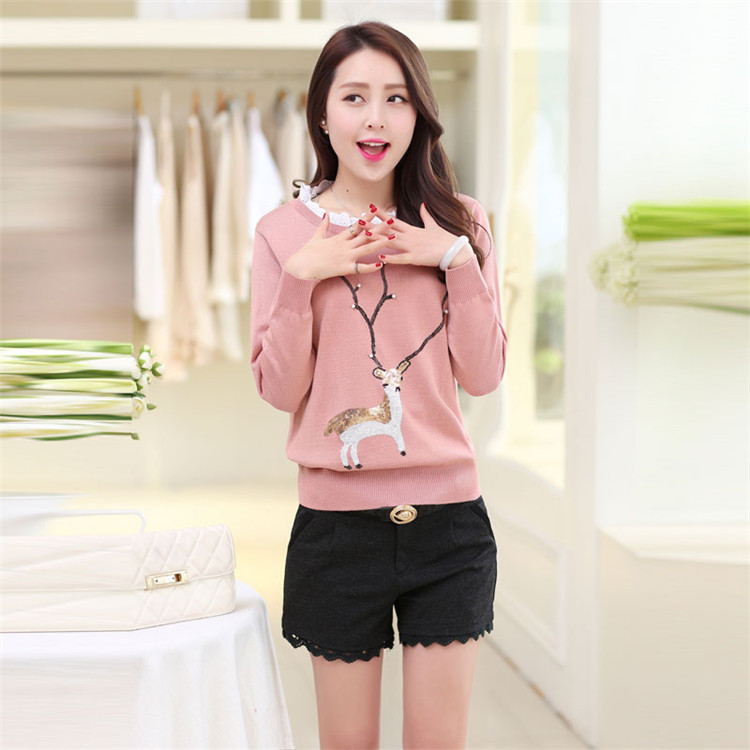 2015韓版秋冬裝新款毛衣女小鹿釘珠亮片刺繡花邊領(lǐng)寬松套頭打底衫 /