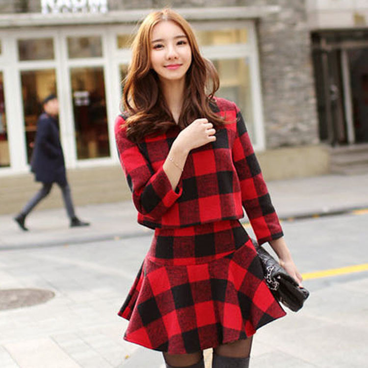 秋冬女裝新款兩件套連衣裙韓版格子短上衣A字裙毛呢套裝短裙 /