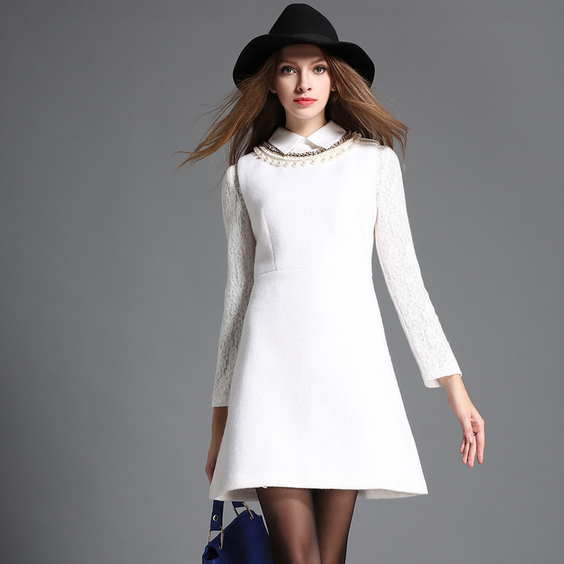 2015新品手工鑲珠無袖毛呢連衣裙 寬松中長款女士連衣裙厚款冬裝 /