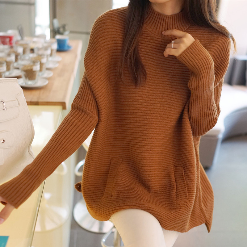 毛衣女秋冬新款韓版寬松套頭打底針織衫大碼中長款時(shí)尚口袋外套女 /