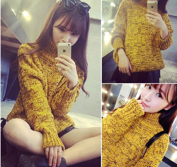 韓版加厚混色寬松高領棒針套頭蝙蝠袖毛衣女裝套頭衫批發(fā) /
