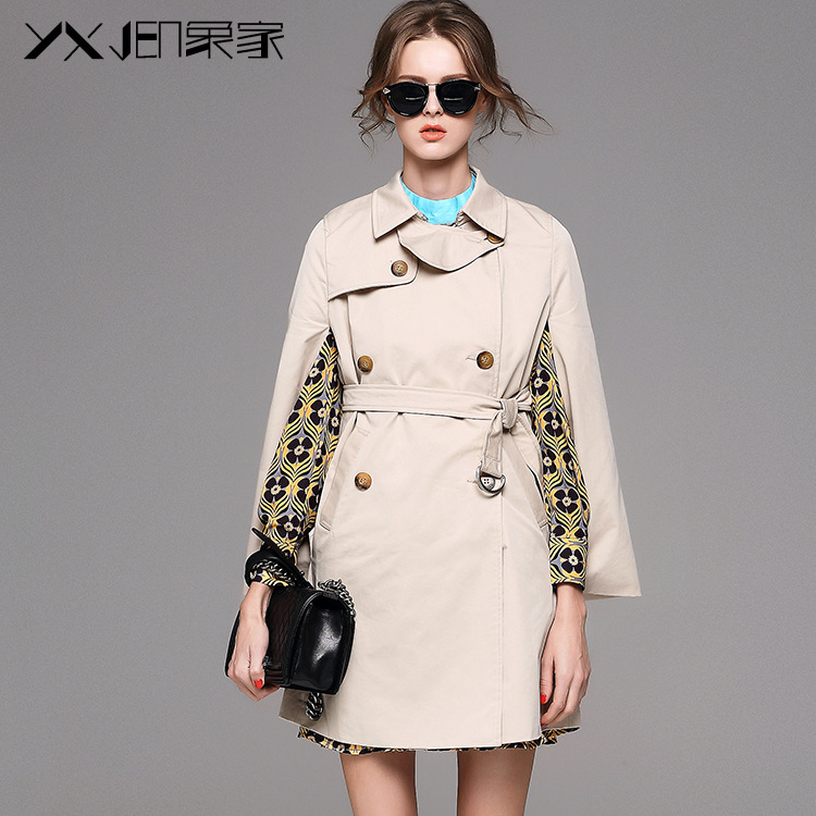 歐美品牌女裝代銷2015秋季新款女式雙排扣中長款風衣斗篷外套腰帶 /