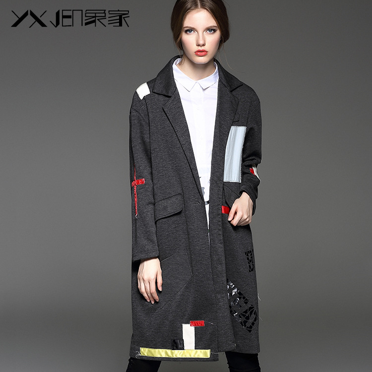 歐洲站寬松休閑個性貼布拼接羅馬棉西裝領長款外套女潮廠家直銷 /