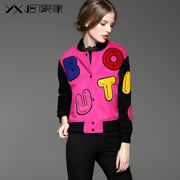 歐洲站撞色拼接植絨字母毛呢棒球服 立領短款毛呢外套女秋冬新款 /