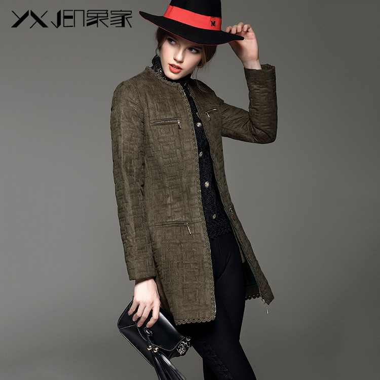 歐洲站高端2015秋季新品女士氣質長袖花邊幾何中長款鹿皮絨外套 /