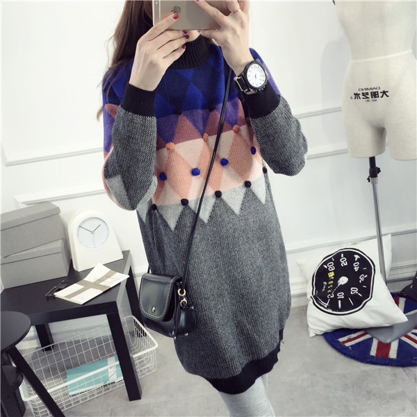 批發毛衣女套頭拼色小球球長款冬裝外套寬松毛線衣韓版潮冬季學生 /