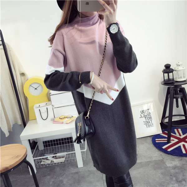 毛衣女套頭中長款甜美高領打底衫加厚毛衣裙冬裝拼色女款毛衣冬季 /