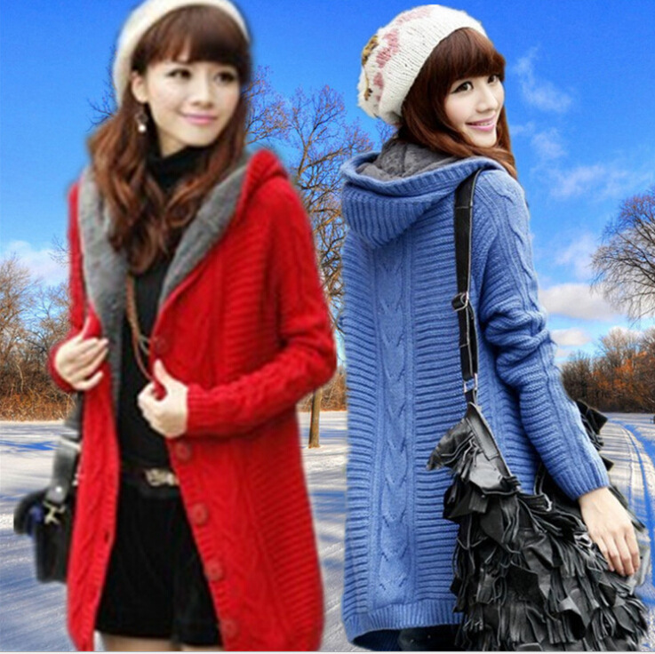 2015秋冬新款女式針織衫 韓版麻花保暖中長(zhǎng)款加絨加厚毛衣外套女 /