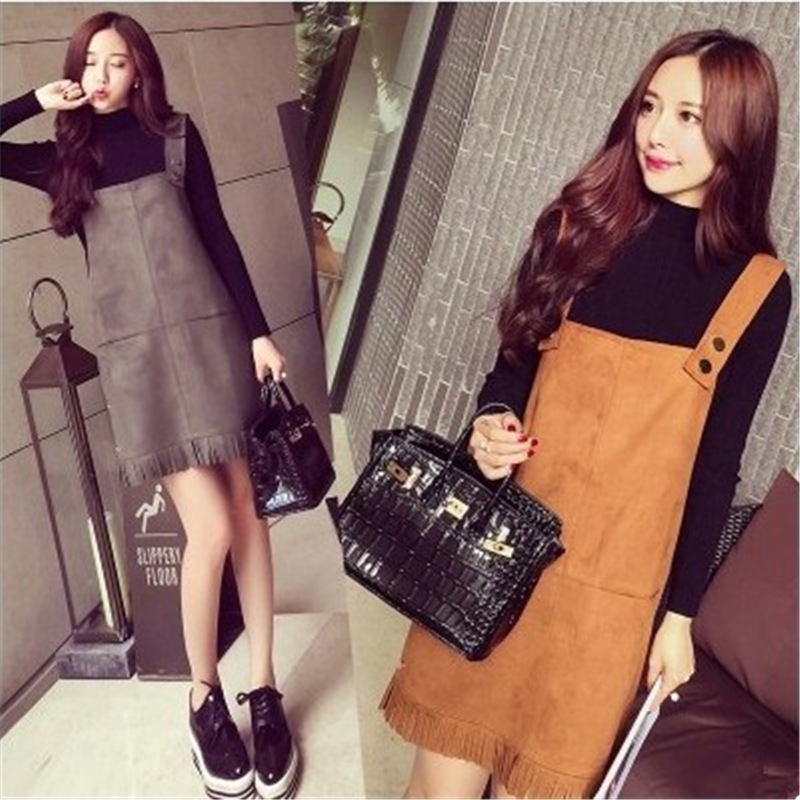 2015秋冬裝新款韓版麂皮絨流蘇寬松套頭中腰A字背帶裙連衣裙 /
